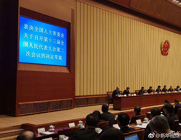 @新華視點(diǎn) 官方微博12月29日消息,十三屆全國人大常委會第七次會議當(dāng)日表決通過了關(guān)于召開十三屆全國人大二次會議的決定。根據(jù)決定,十三屆全國人大二次會議將于2019年3月5日在京召開。