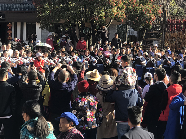 7日下午,游客在麗江古城內觀賞表演。本文圖均為麗江古城管理局 供圖