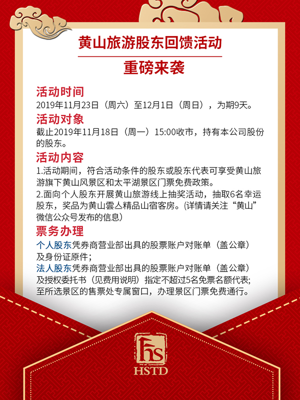 根據公告,活動時間為2019年11月23日至12月1日,為期9天。截至2019年11月18日15時收市,持有黃山旅游股份的股東可享受黃山旅游旗下黃山風景區和太平湖景區門票免費政策。