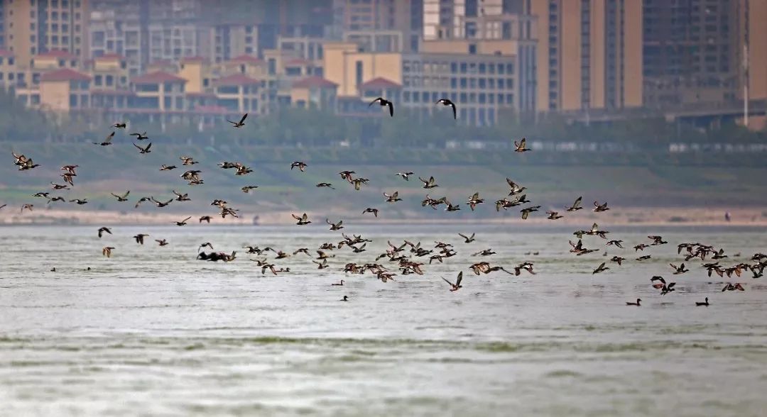 △2017年12月10日,在四川宜賓,上千只綠頭鴨、綠翅鴨、赤麻鴨等過冬水鳥在長江上嬉戲(圖/視覺中國)